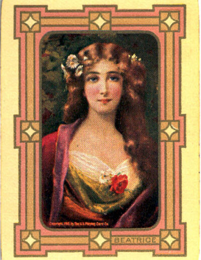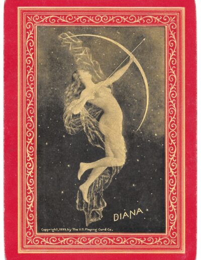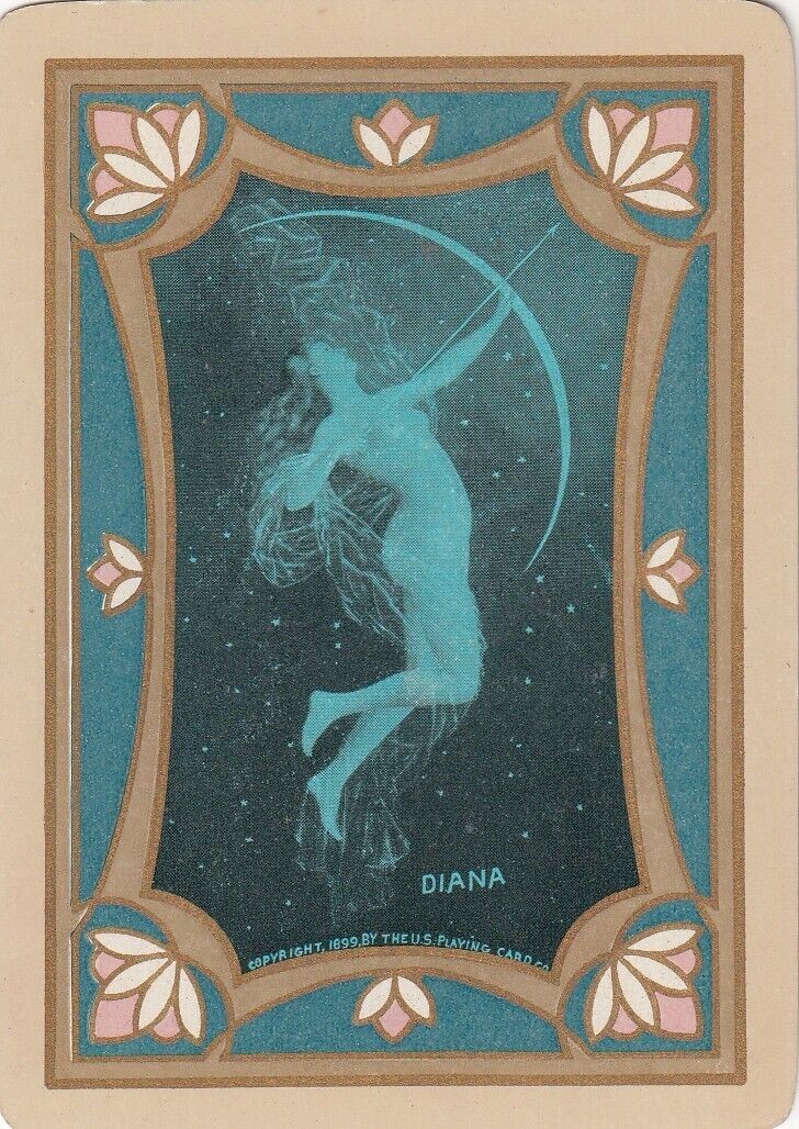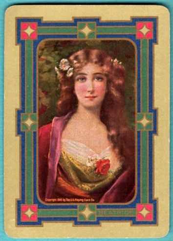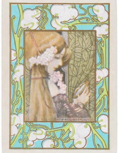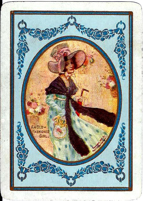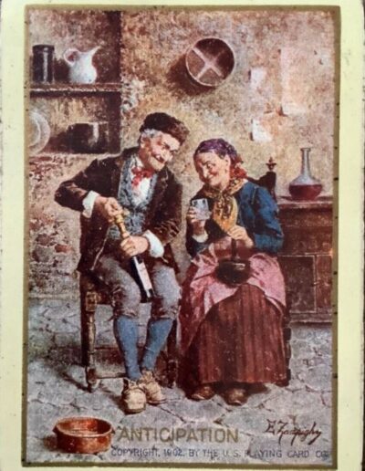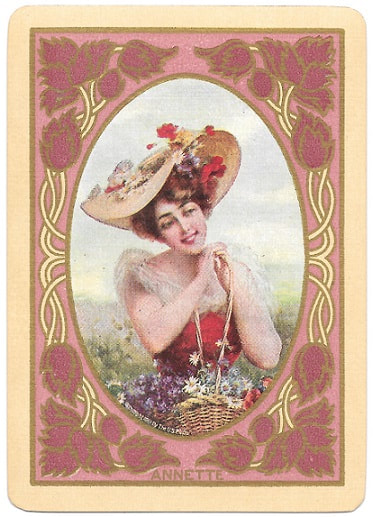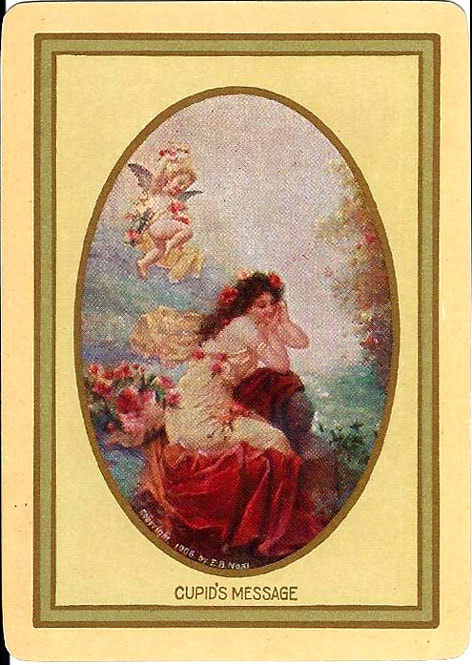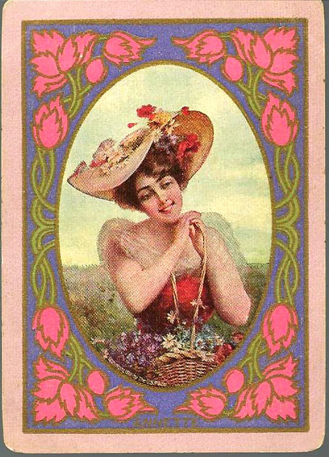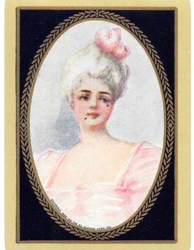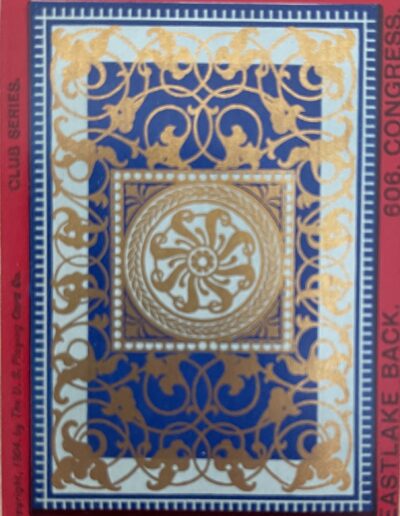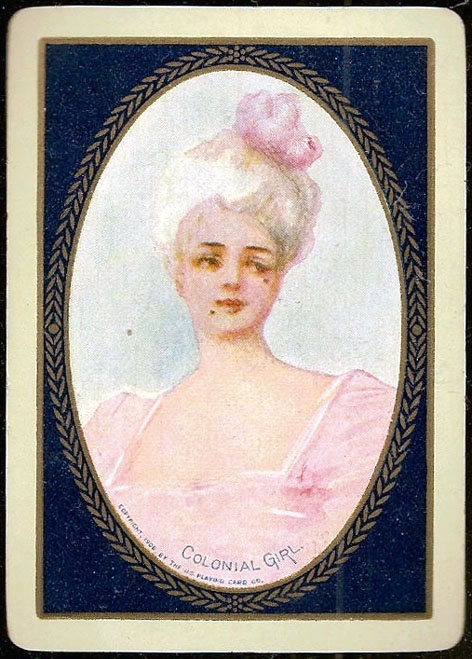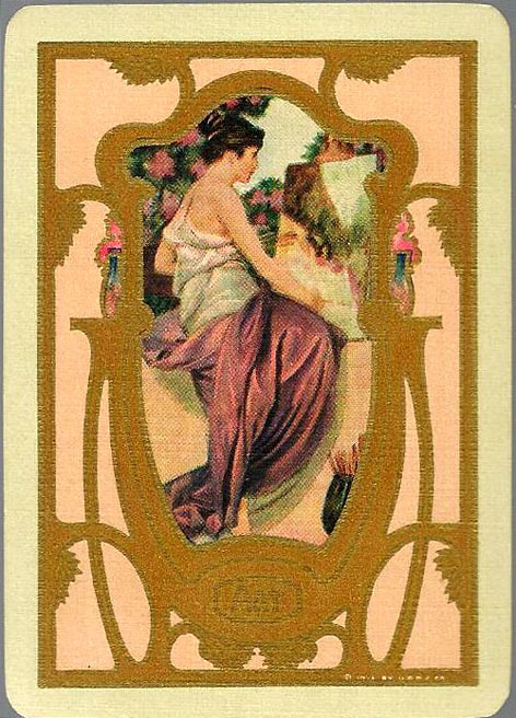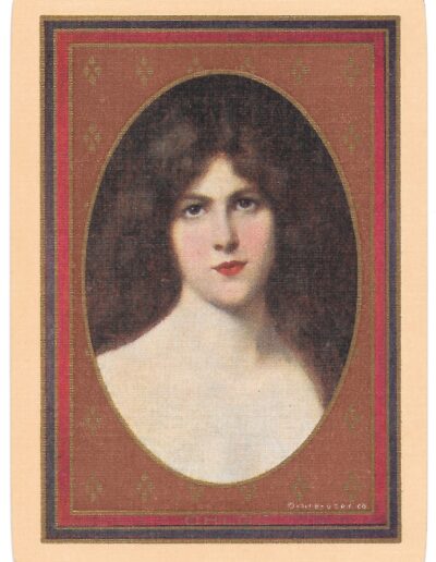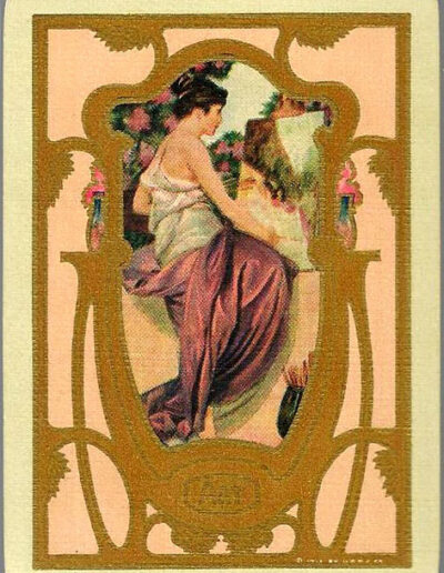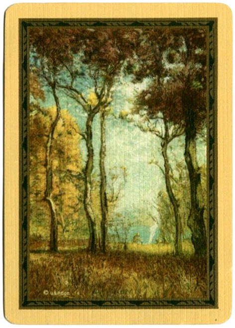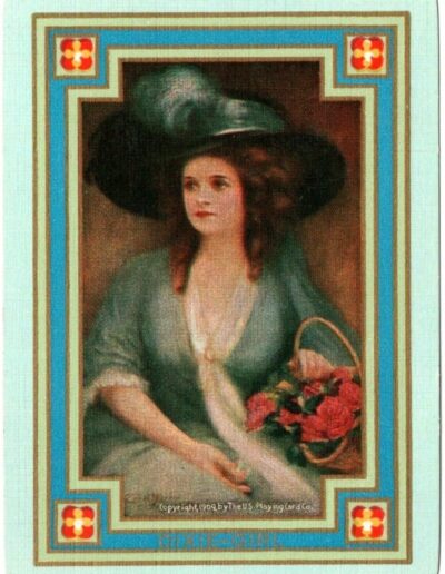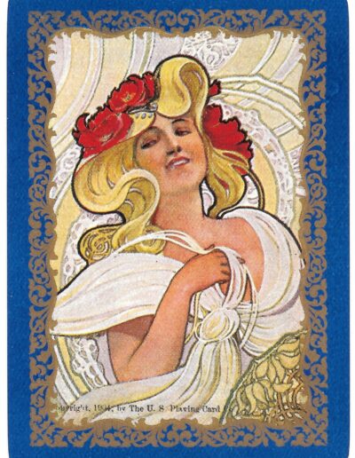 The Pictorial Series began in 1899 just before the United States Playing Card Company moved to a new factory in Norwood, Ohio, opening there in 1901. These back designs used popular artwork from American and European artists. These “Wide Size” (also known as Poker Size) cards were in use until 1924. When whist and later bridge became the card games of choice, the Congress line started printing “Bridge Size” in 1916, and in 1925 the wide size decks became obsolete. Pictured below are every known back design and color/border variation, along with dates and aces used. We strive to be as accurate as possible and will make any necessary changes as they arise.